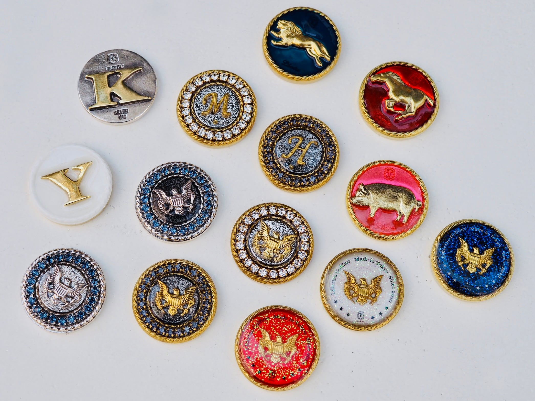 イニシャルのゴルフマーカーはまさに定番。シルバー製やクリスタルをあしらったものなど、様々なタイプをご用意しています。ご自身用のみならず、ギフトとしても人気です。